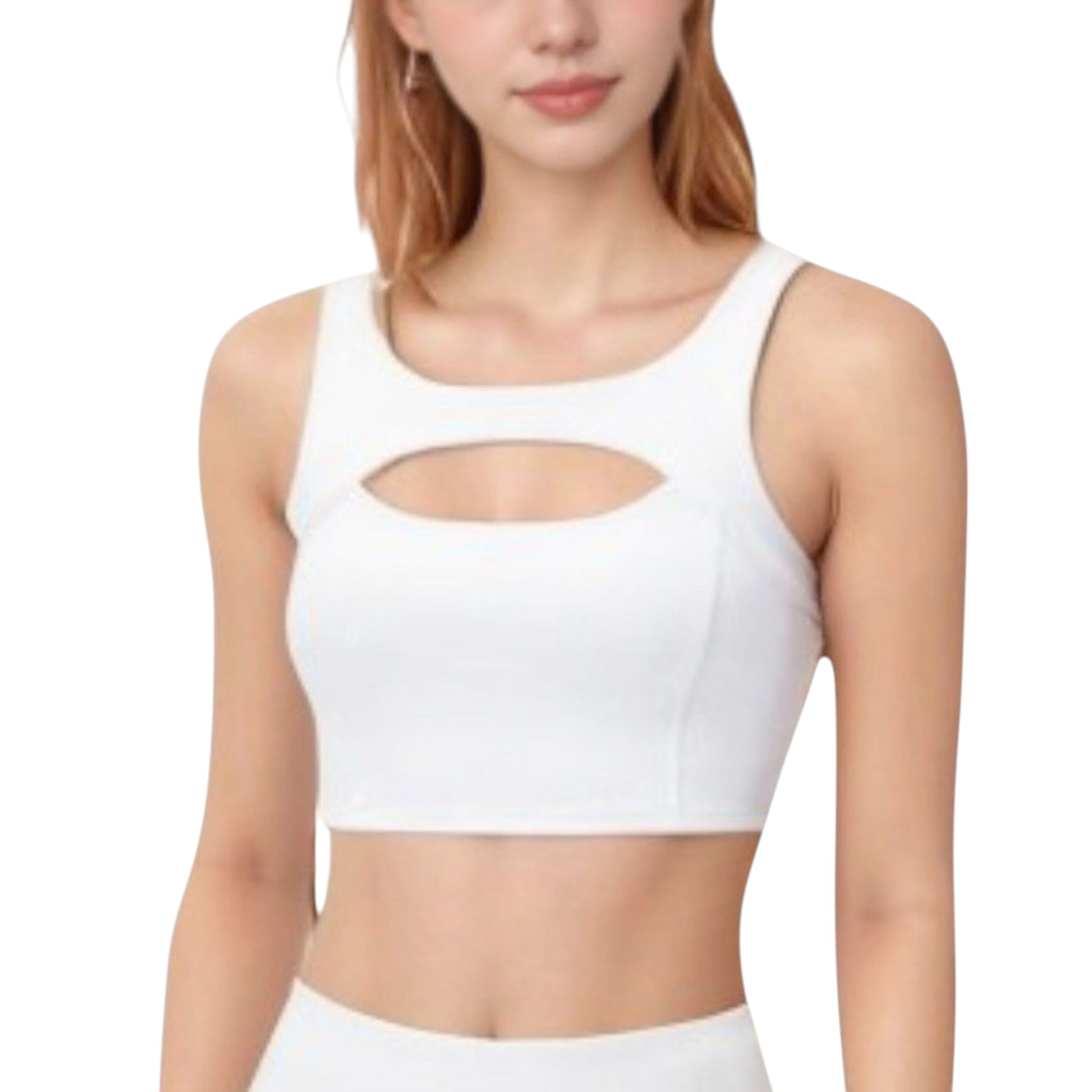 This women's sports bra combines style and support with a modern cutout front detail and scoop neckline. Designed for low to medium impact activities, the wide straps and structured underbust band offer a secure, flattering fit. The soft, stretchy fabric keeps you comfortable through every move, whether you're at yoga, pilates, or running errands. A bold yet functional choice for any activewear collection.