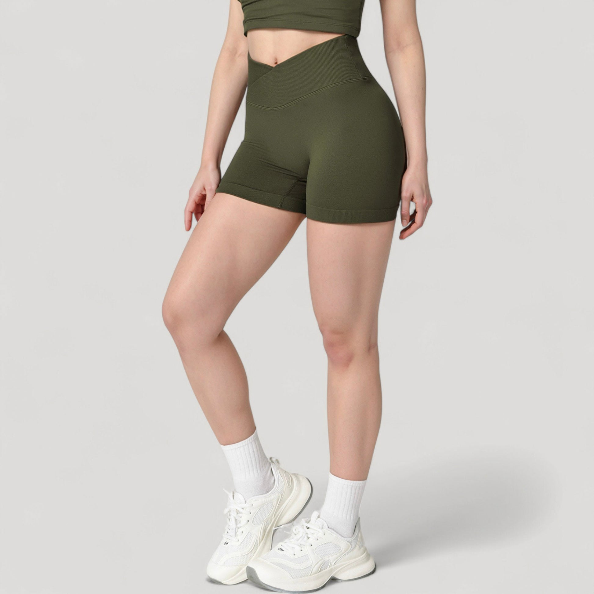 High Waist Seamless Ribbed Biker Shorts with Crossover Waistband and Compression Fit