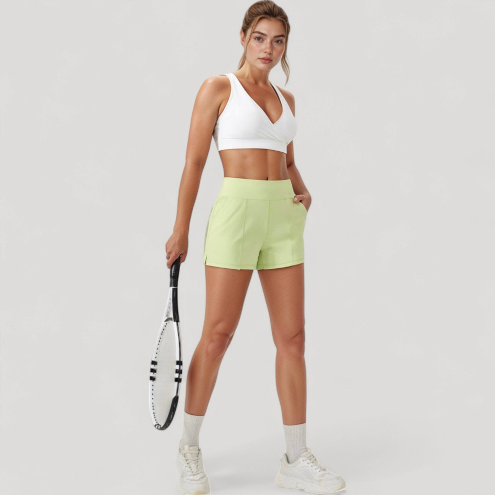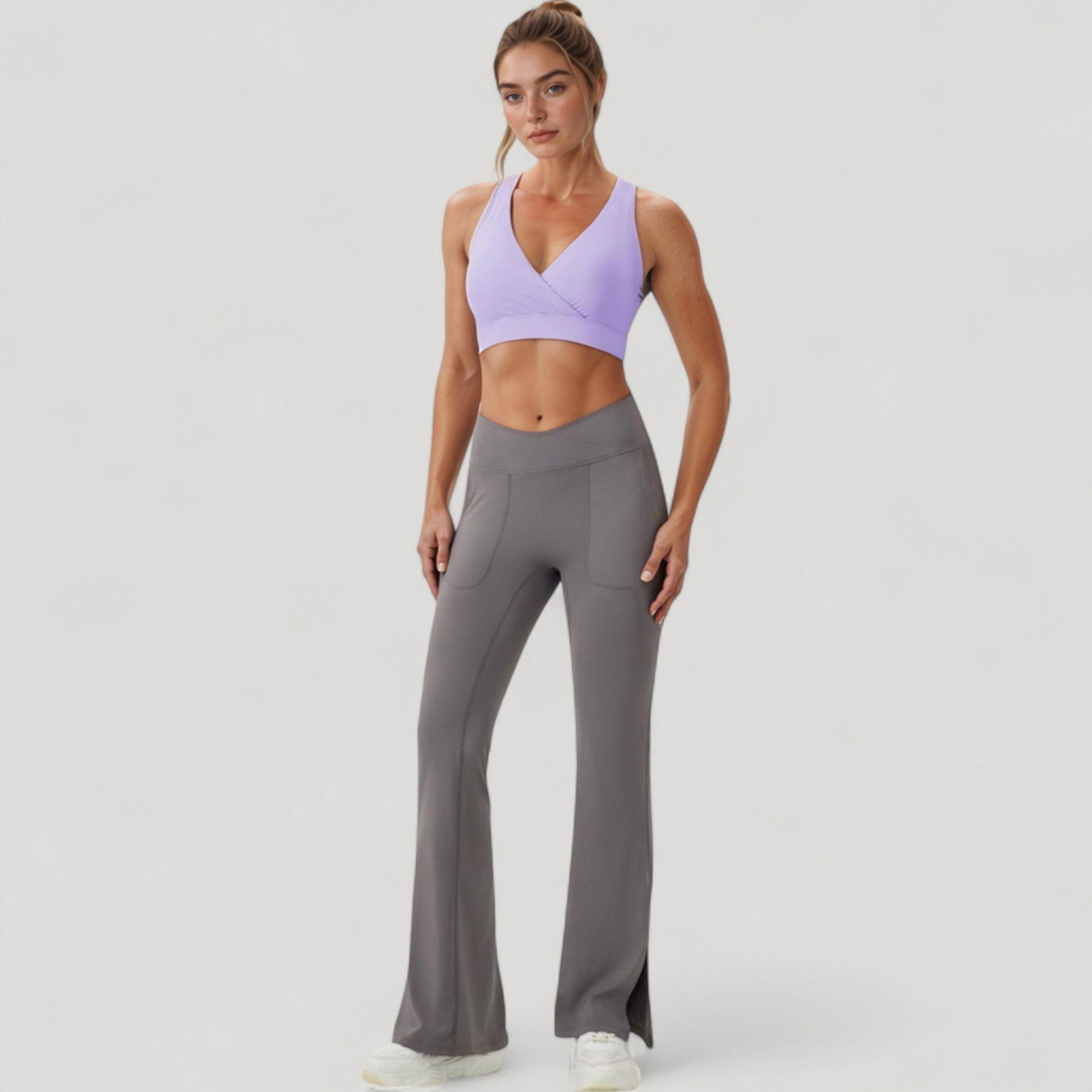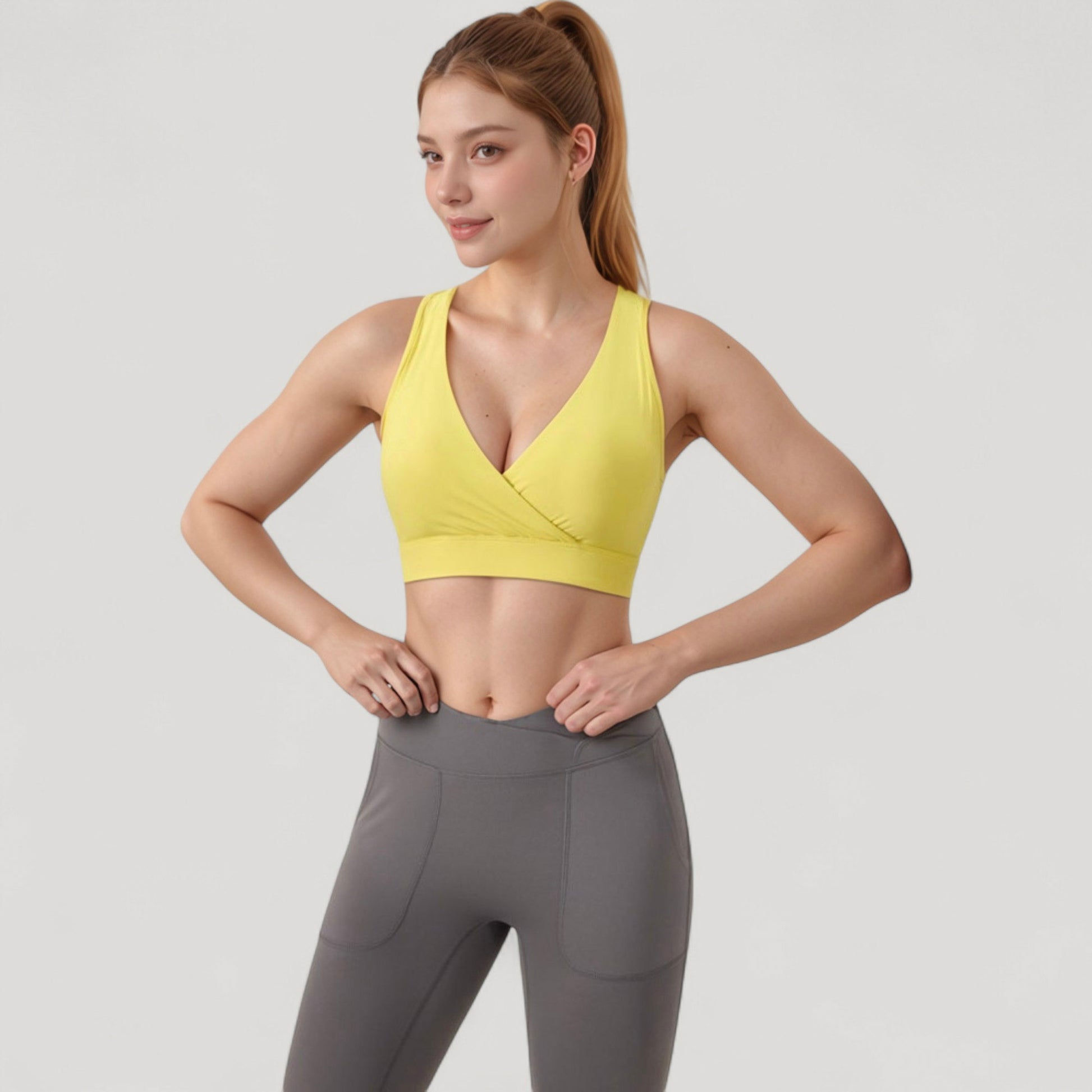 This women's sports bra features a stylish crossover V-neck design that adds a flattering and feminine touch to your activewear. Crafted with a wide underband and thick shoulder straps, it provides medium support ideal for yoga, Pilates, or light cardio. The soft, breathable fabric offers a smooth feel against the skin while allowing full range of motion. Designed for both performance and comfort, this bra blends supportive function with a sleek, sculpted silhouette.