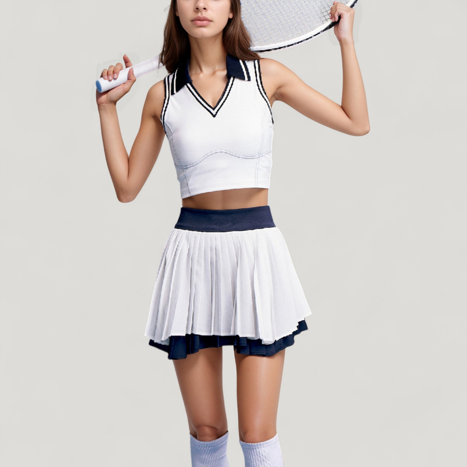 Sleeveless Cropped Tennis Top with Contrast Collar and V-Neckline