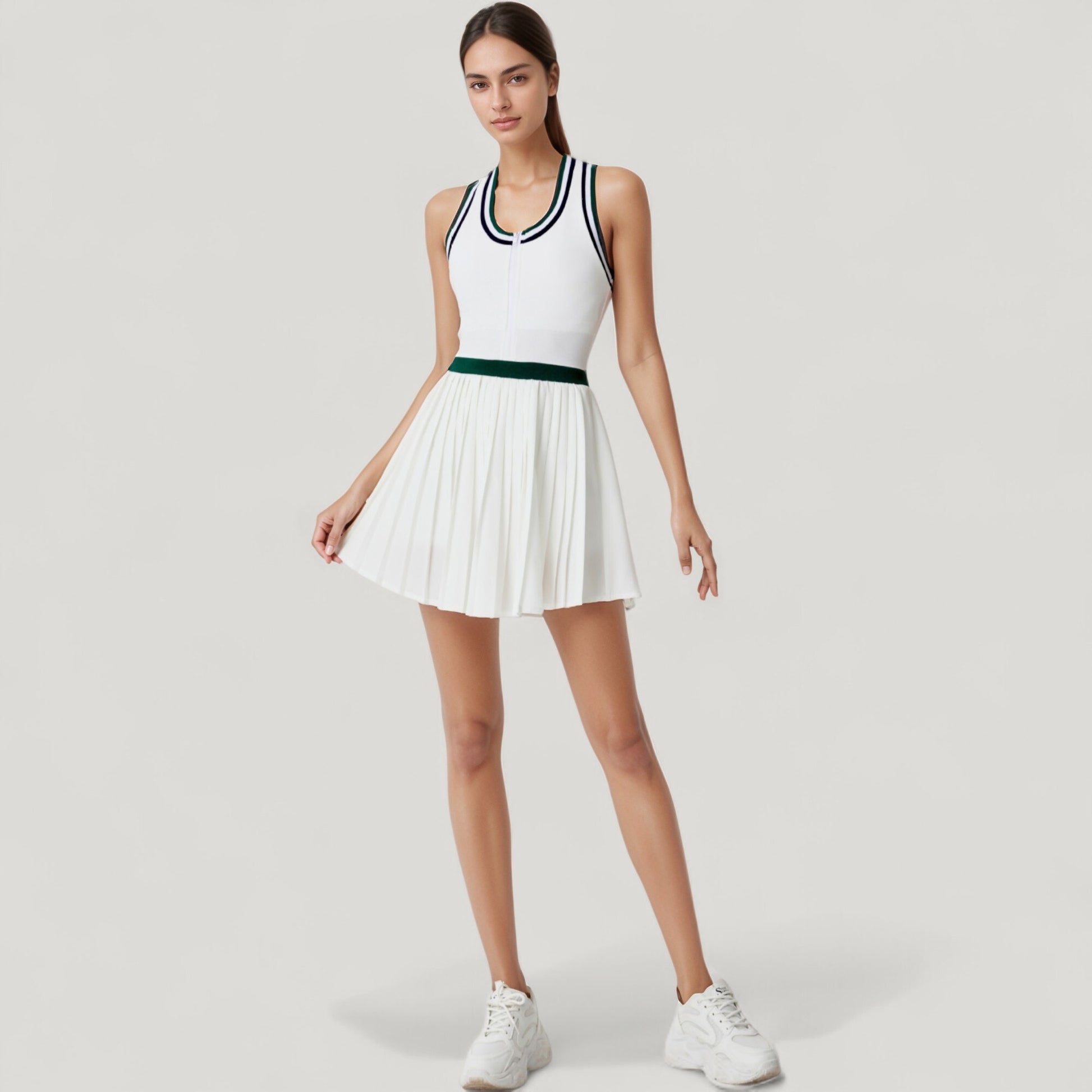 Sleeveless Tennis Dress with Zip Front Contrast Trim Neckline and Pleated Skirt
