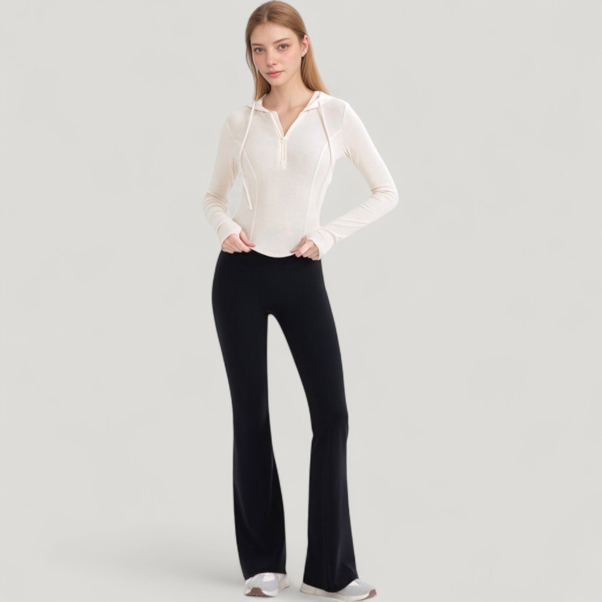 The Anna-Kaci Women's Long Sleeve Pullover Hoodie Top blends sleek style with functional comfort. Featuring a flattering contoured fit, this top includes a half zip front for adjustable coverage and a cozy hood for added versatility. The thumbhole cuffs provide a secure feel while enhancing warmth, and the smooth seam detailing offers a streamlined, feminine silhouette. Crafted from soft, stretchy knit fabric, it¡¯s designed for ease of movement and a polished look.