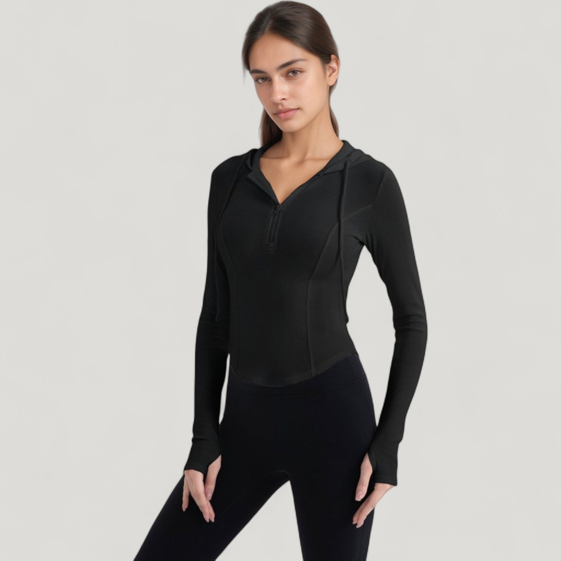 Long Sleeve Pullover Hoodie Top with Half Zip Front and Thumbhole Cuffs