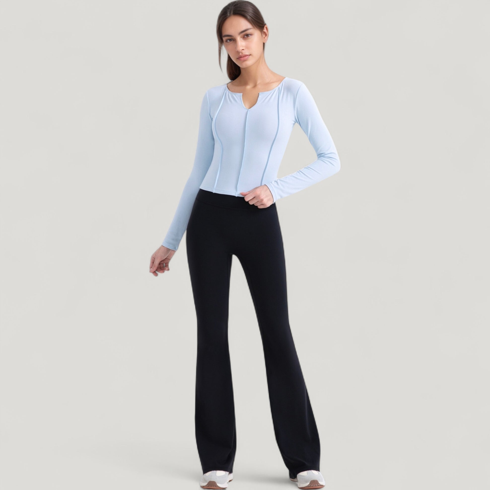 Long Sleeve Fitted Athletic Top with Notch Neckline and Contoured Seams