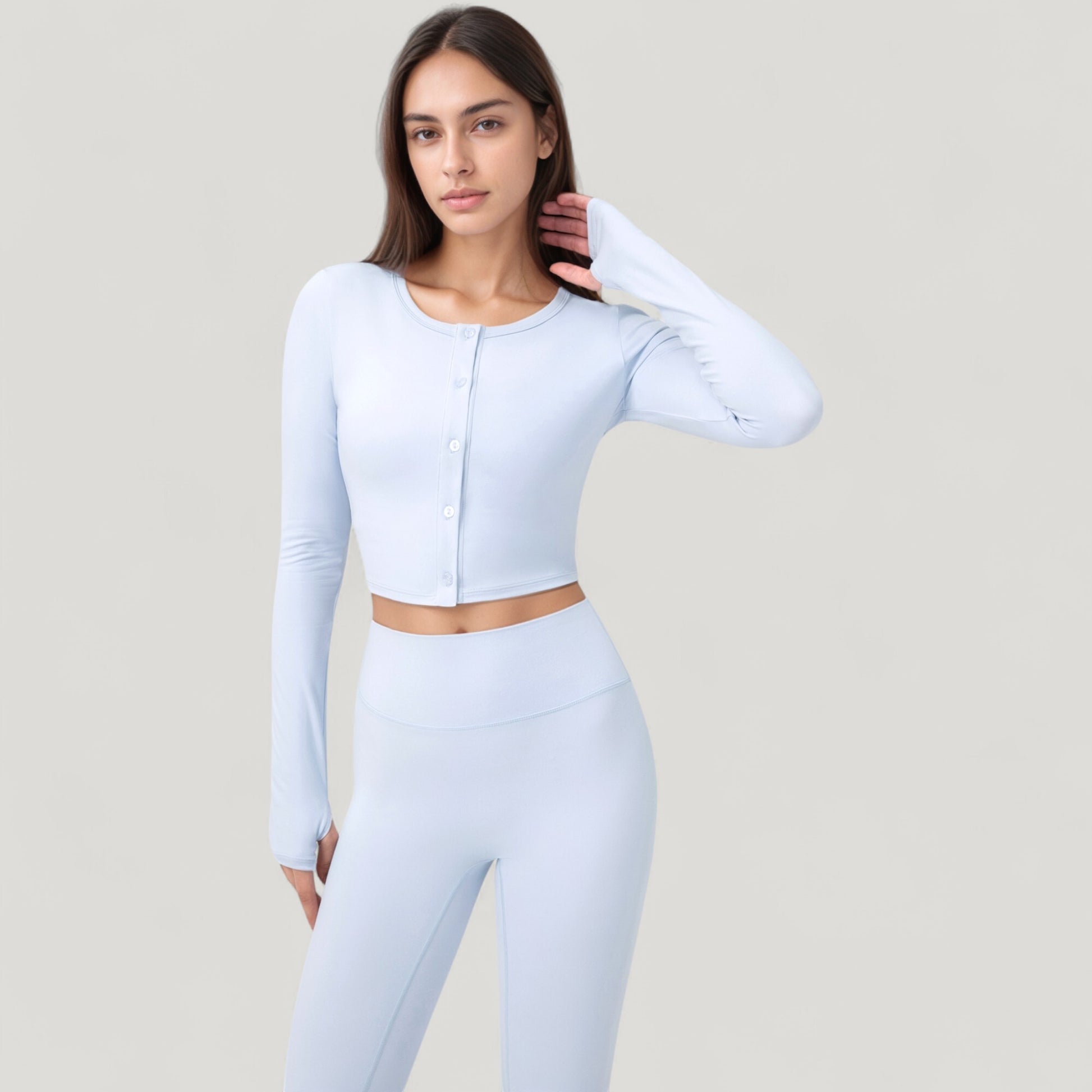 Long Sleeve Cropped Button Front Top with Fitted Stretch Design