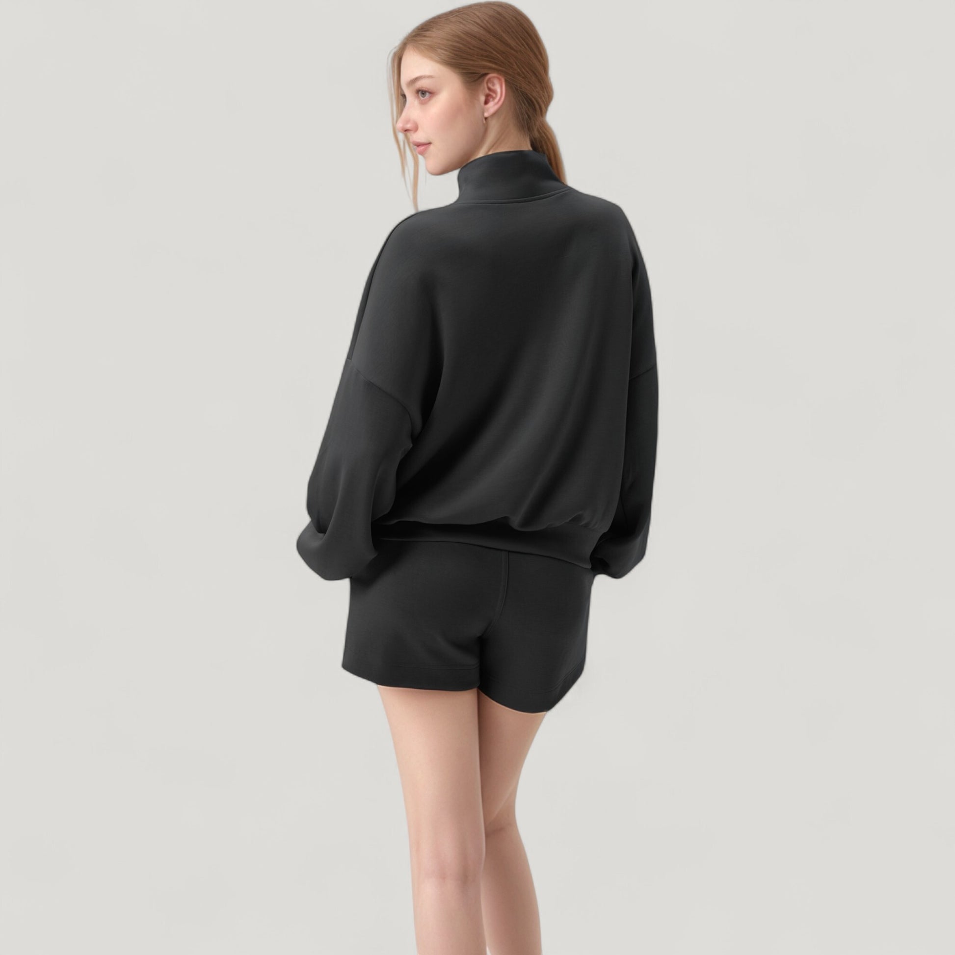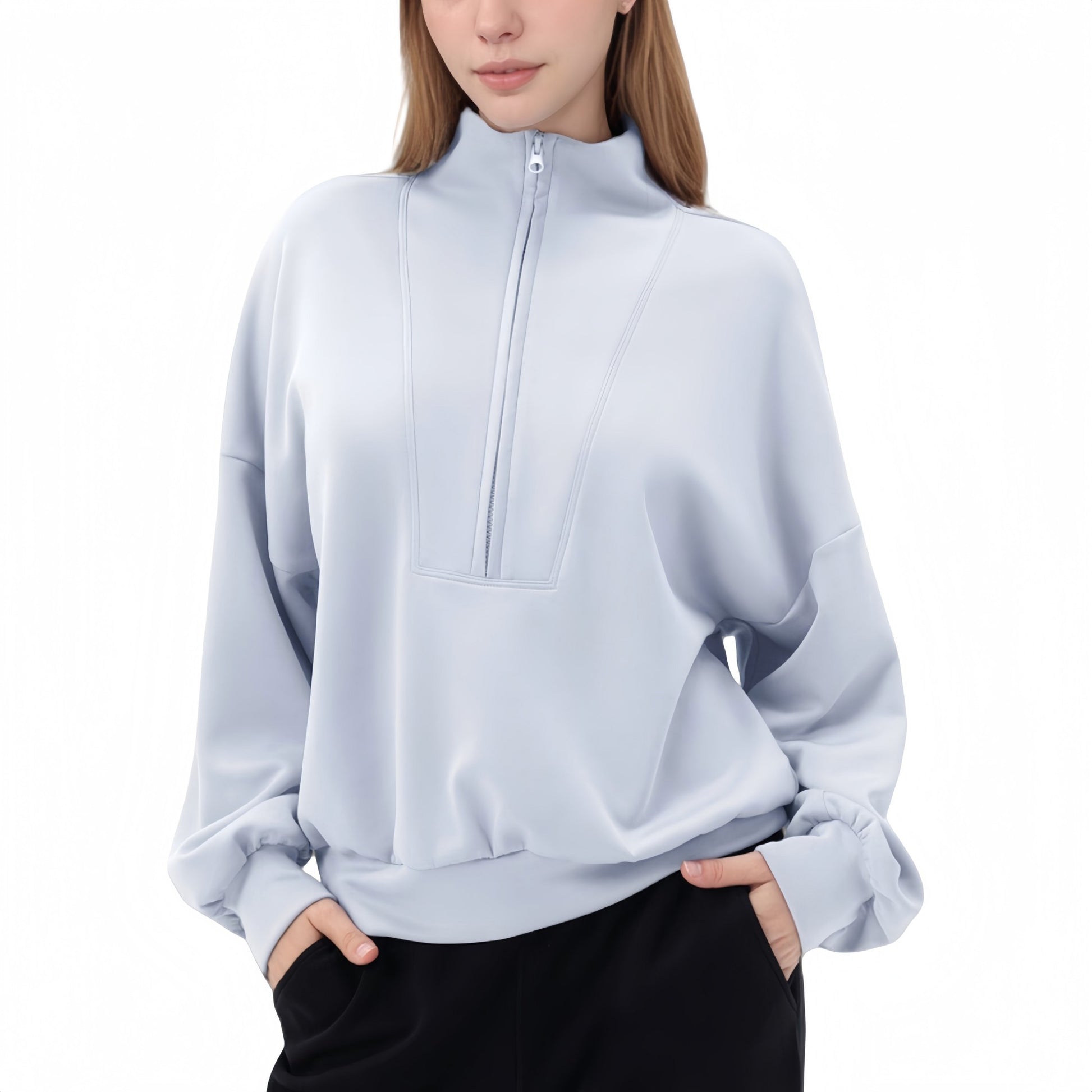 Long Sleeve Woven Half Zip Pullover Top with Stand Collar and Elastic Cuffs