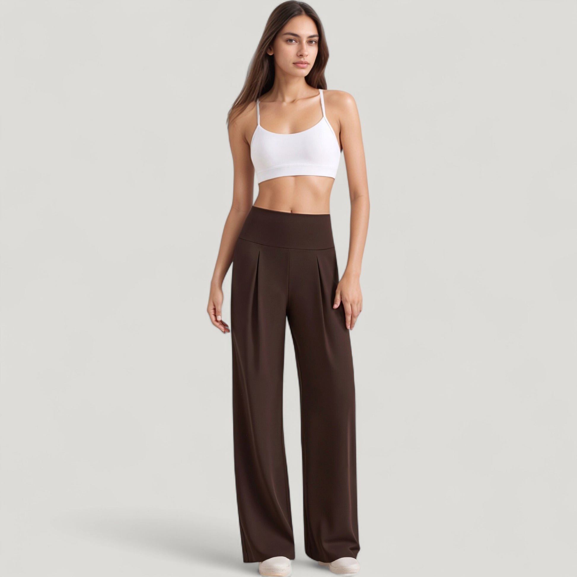 The Anna-Kaci Women's High Waist Wide Leg Pants offer a sophisticated silhouette with a flattering high-rise fit. Designed with front pleats for a touch of tailored style, these pants drape elegantly for a polished yet comfortable look. The wide leg cut allows ease of movement, making them a versatile addition to any wardrobe for both casual and refined outfits.
