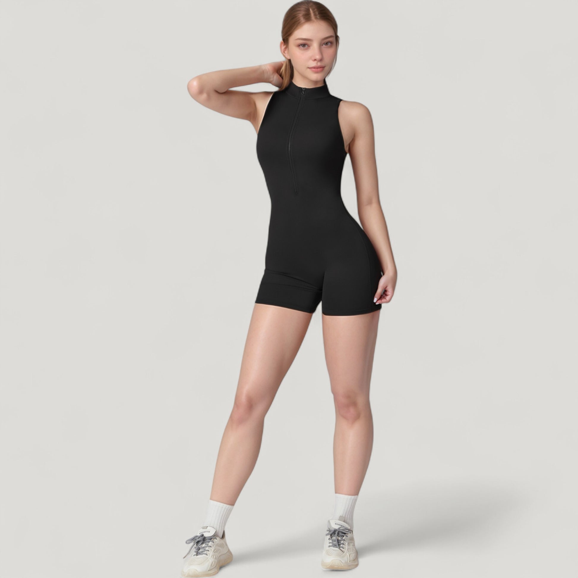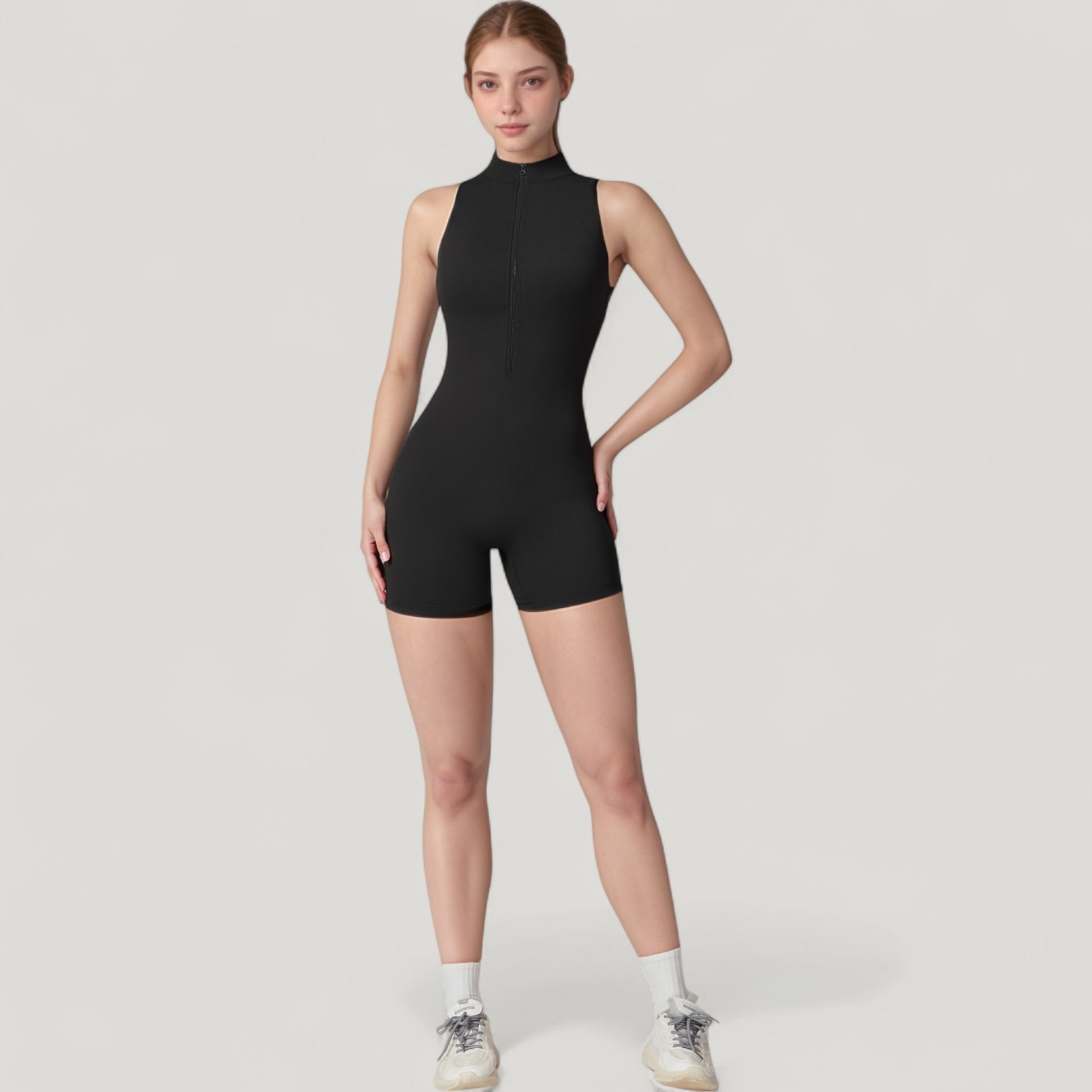 Sleeveless Zip Front Activewear Romper with Open Back and Contoured Fit