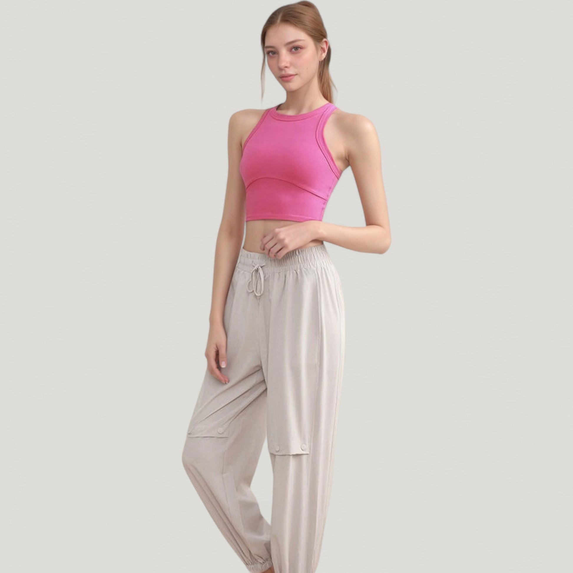 The Anna-Kaci Women's High Neck Racerback Athletic Top combines sleek style with functional comfort. Featuring a supportive high neckline and racerback design, this top provides a secure fit while allowing full range of motion. The contoured seam details enhance the silhouette, and the soft, stretchy fabric ensures a smooth, breathable feel during any activity. Perfect for pairing with leggings, shorts, or joggers, this versatile top easily transitions from workouts to casual wear.