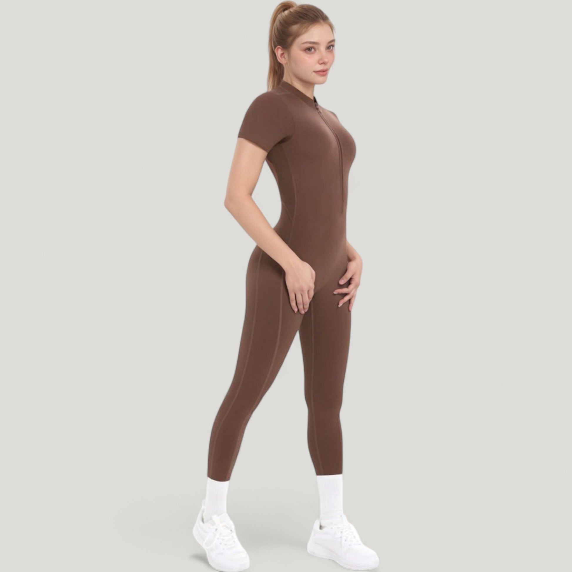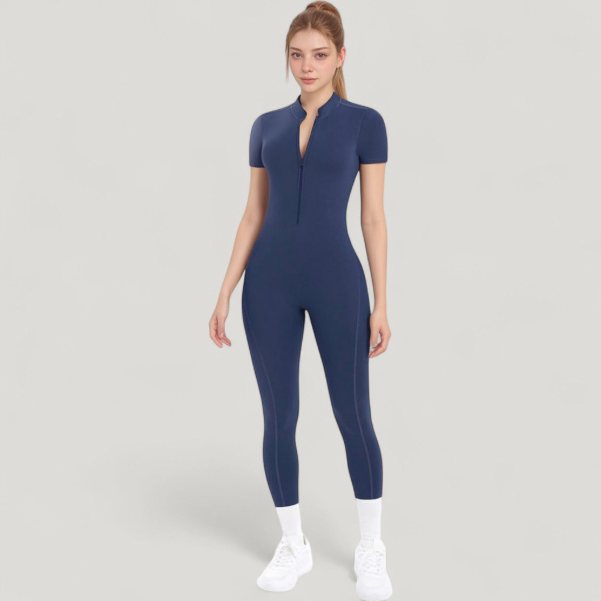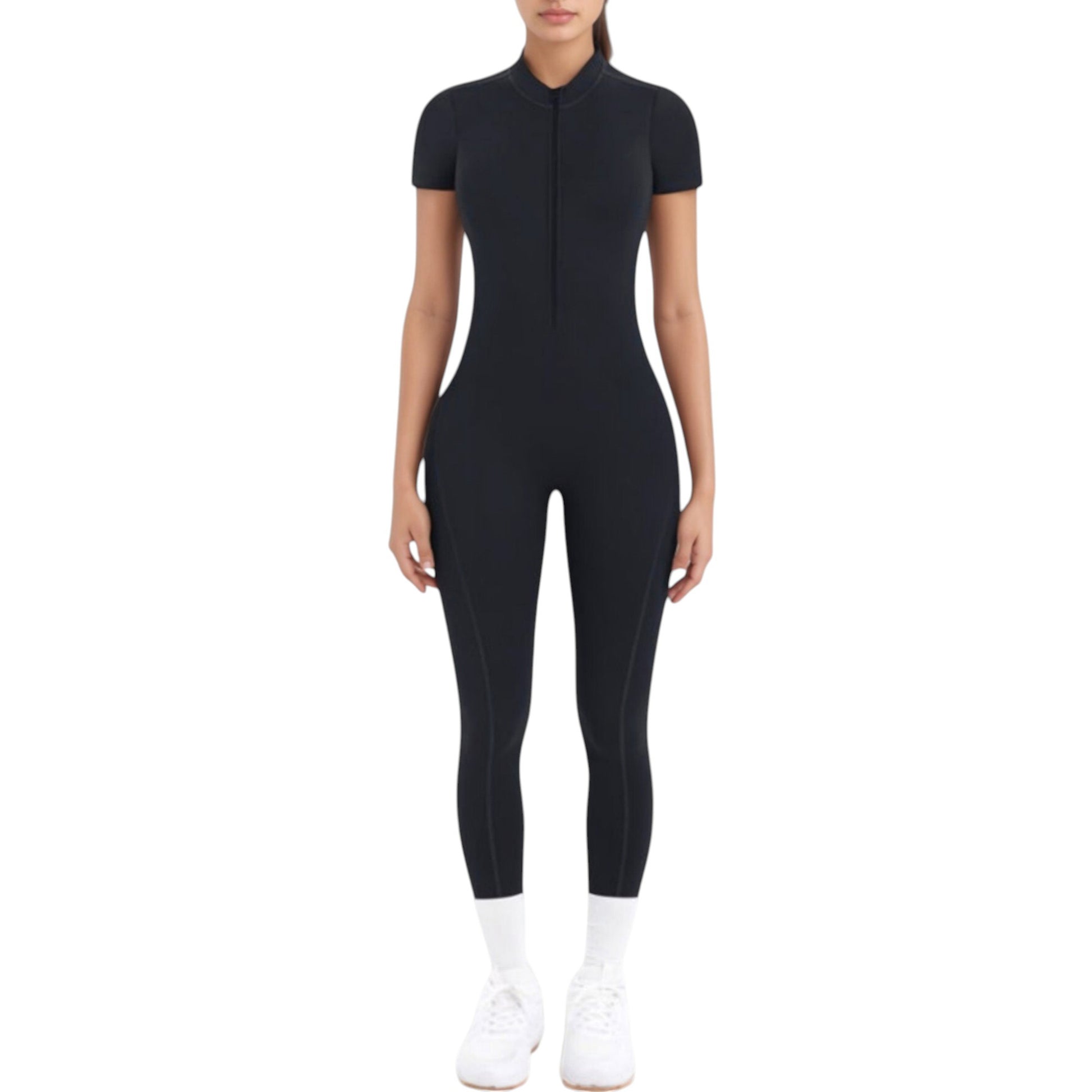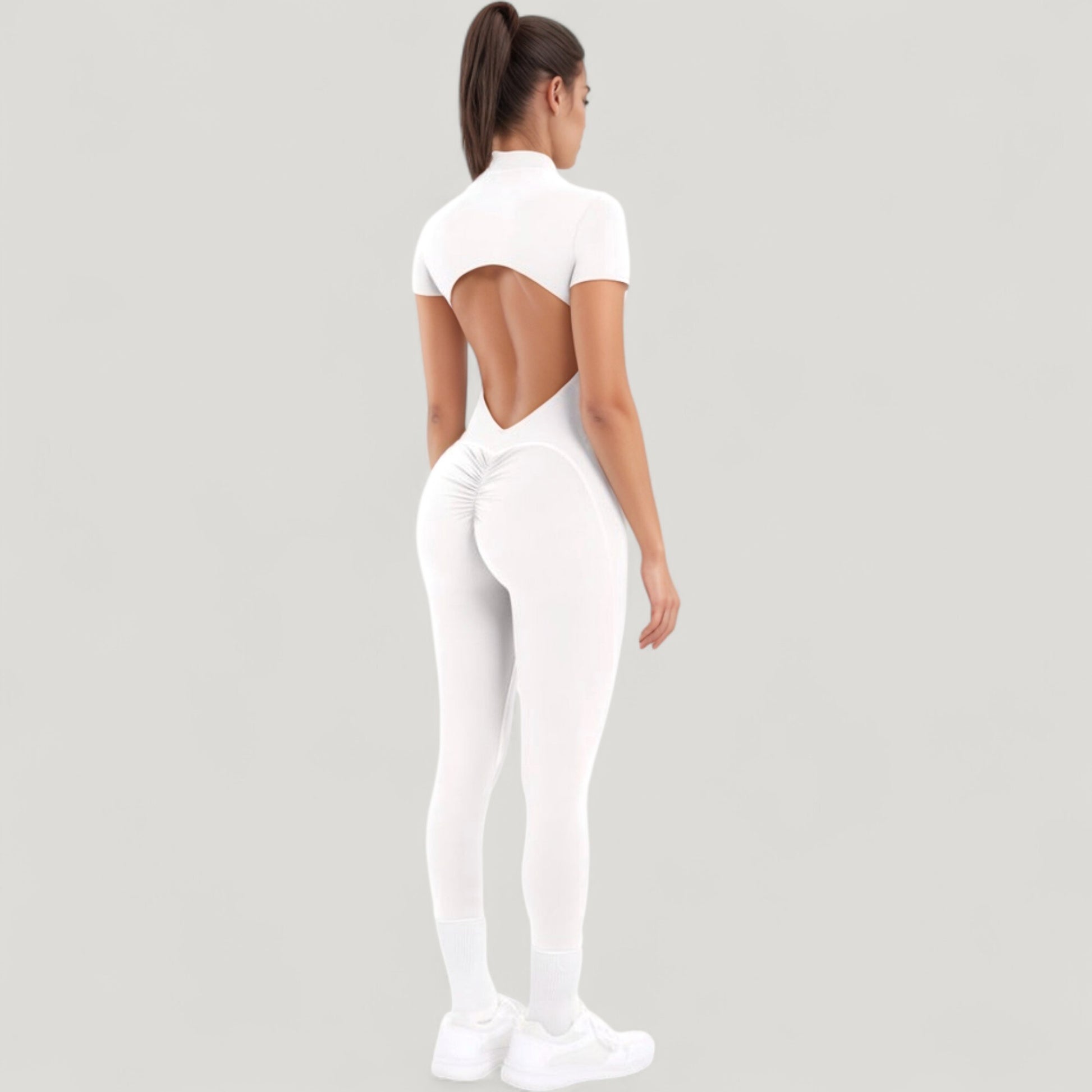 Short Sleeve High Neck Open Back Zip-Up Jumpsuit with Fitted Silhouette and Scrunch Back Detail
