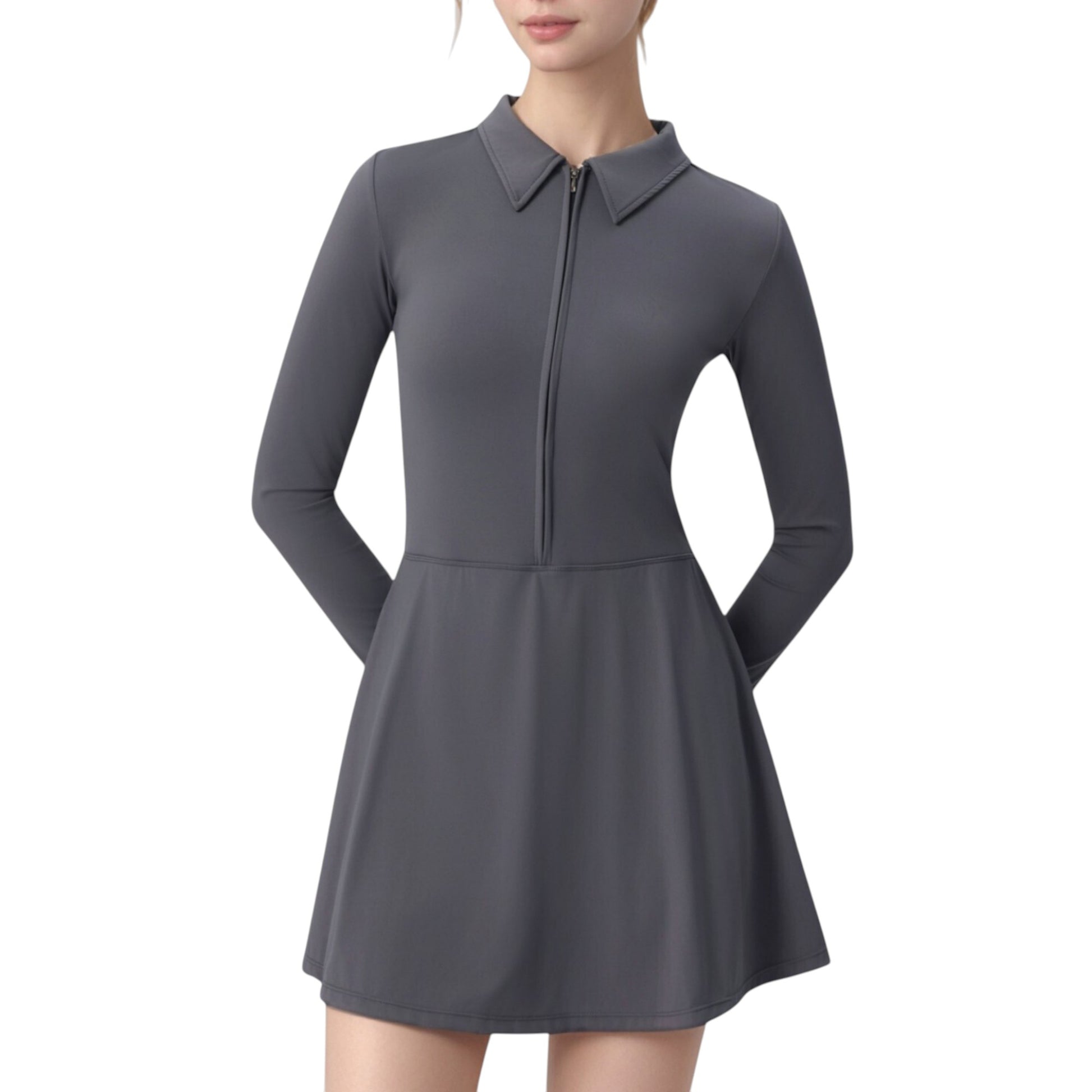 Long Sleeve Active Dress with Zip Front Closure and Pointed Collar