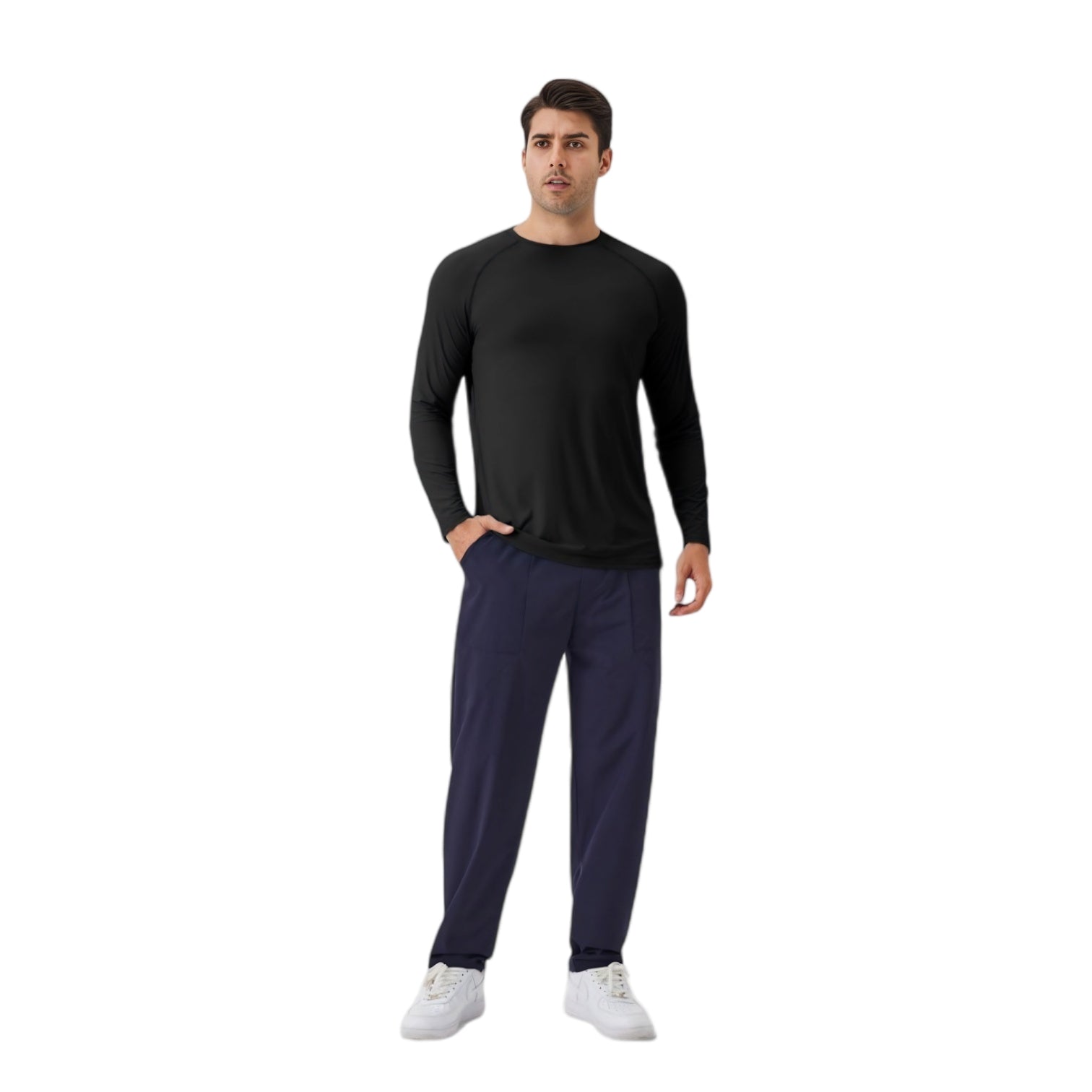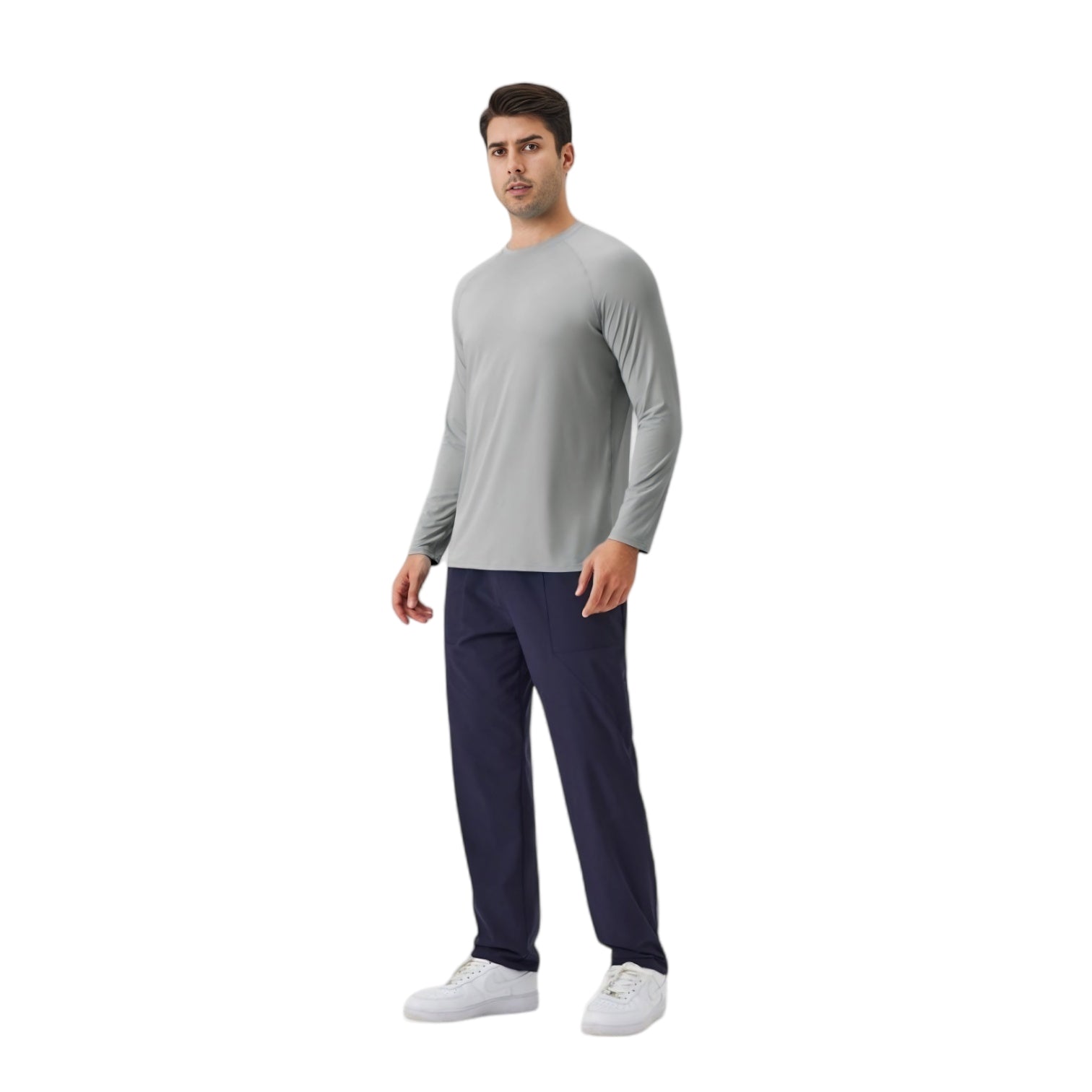 This men's long sleeve performance shirt is designed for comfort and functionality, featuring a smooth, lightweight fabric with excellent stretch for ease of movement. The raglan sleeves provide an athletic fit, while the moisture-wicking material keeps you cool and dry throughout the day. Whether you're working out, running errands, or relaxing, this shirt offers a clean look and reliable comfort. A versatile essential for active and casual wear alike.