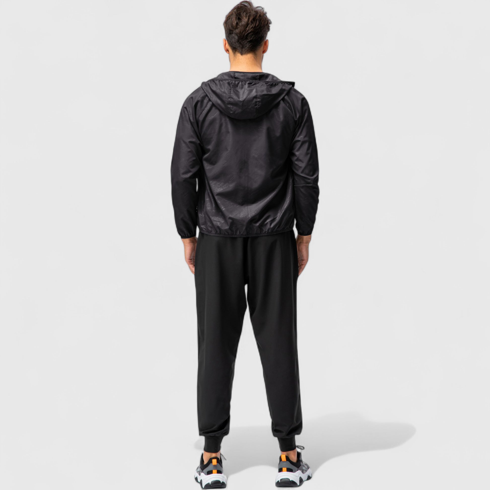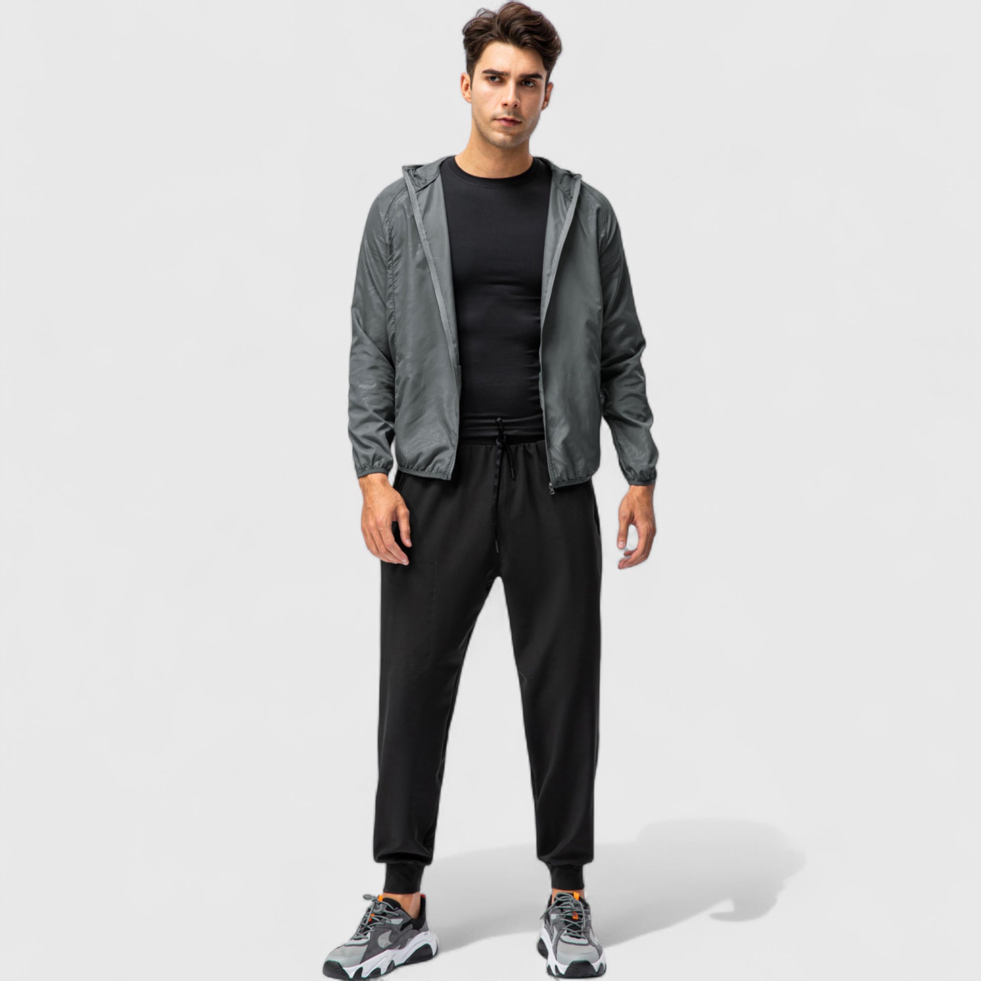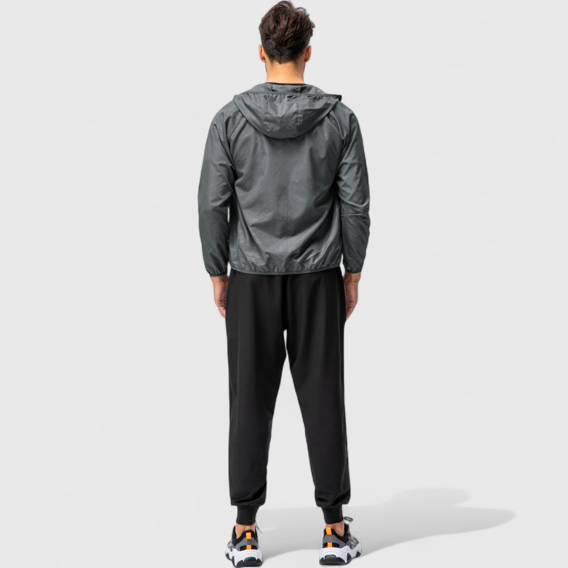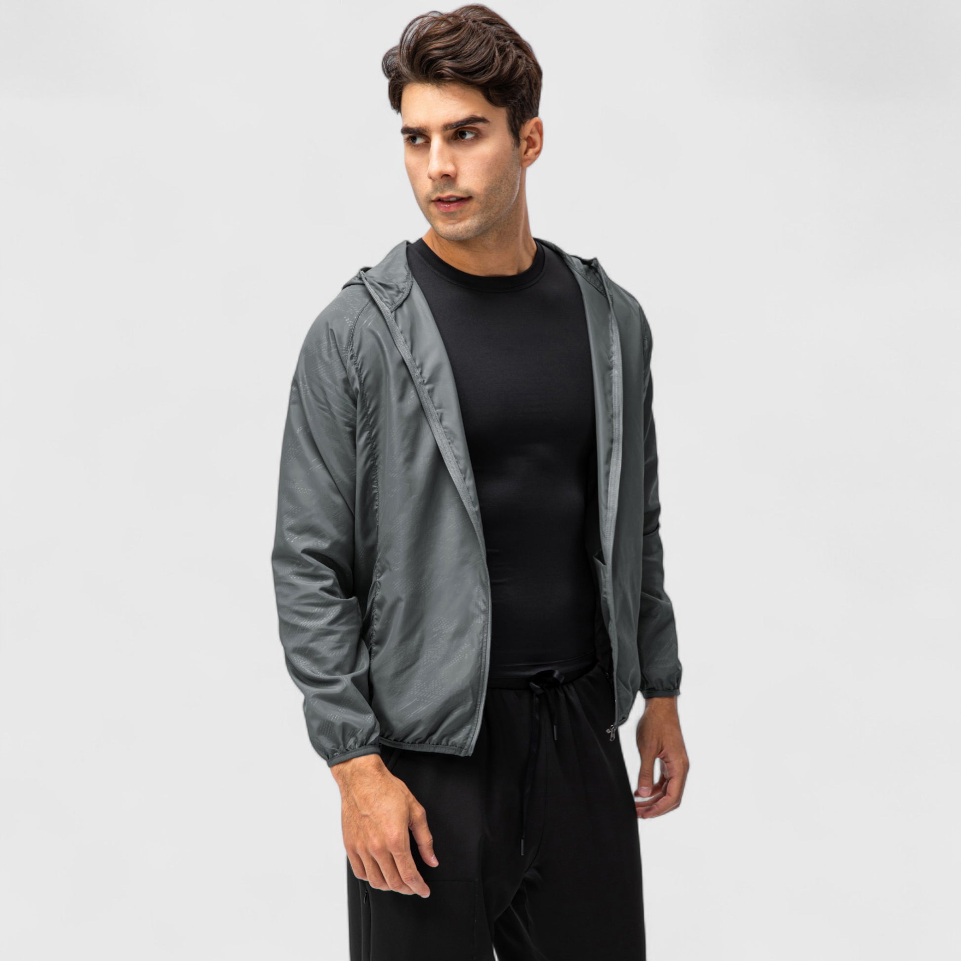 This men¡¯s hooded windbreaker jacket features a sleek zip-up front and a lightweight, streamlined design. The fitted hood and elastic cuffs help block out wind, while the side pockets offer convenient storage. Its minimalist style makes it easy to layer for transitional weather or outdoor workouts.