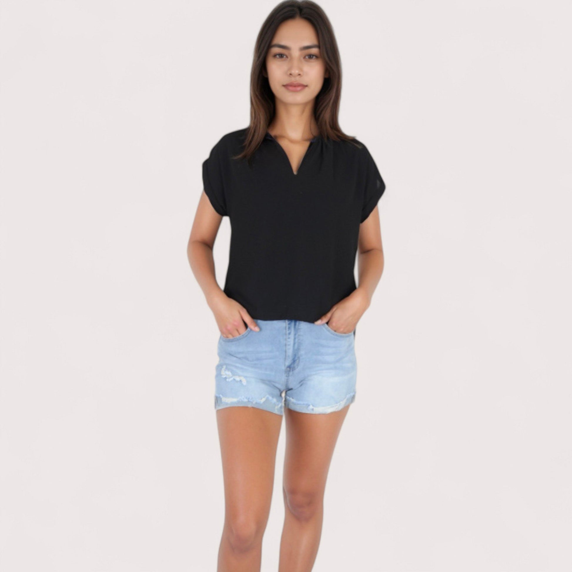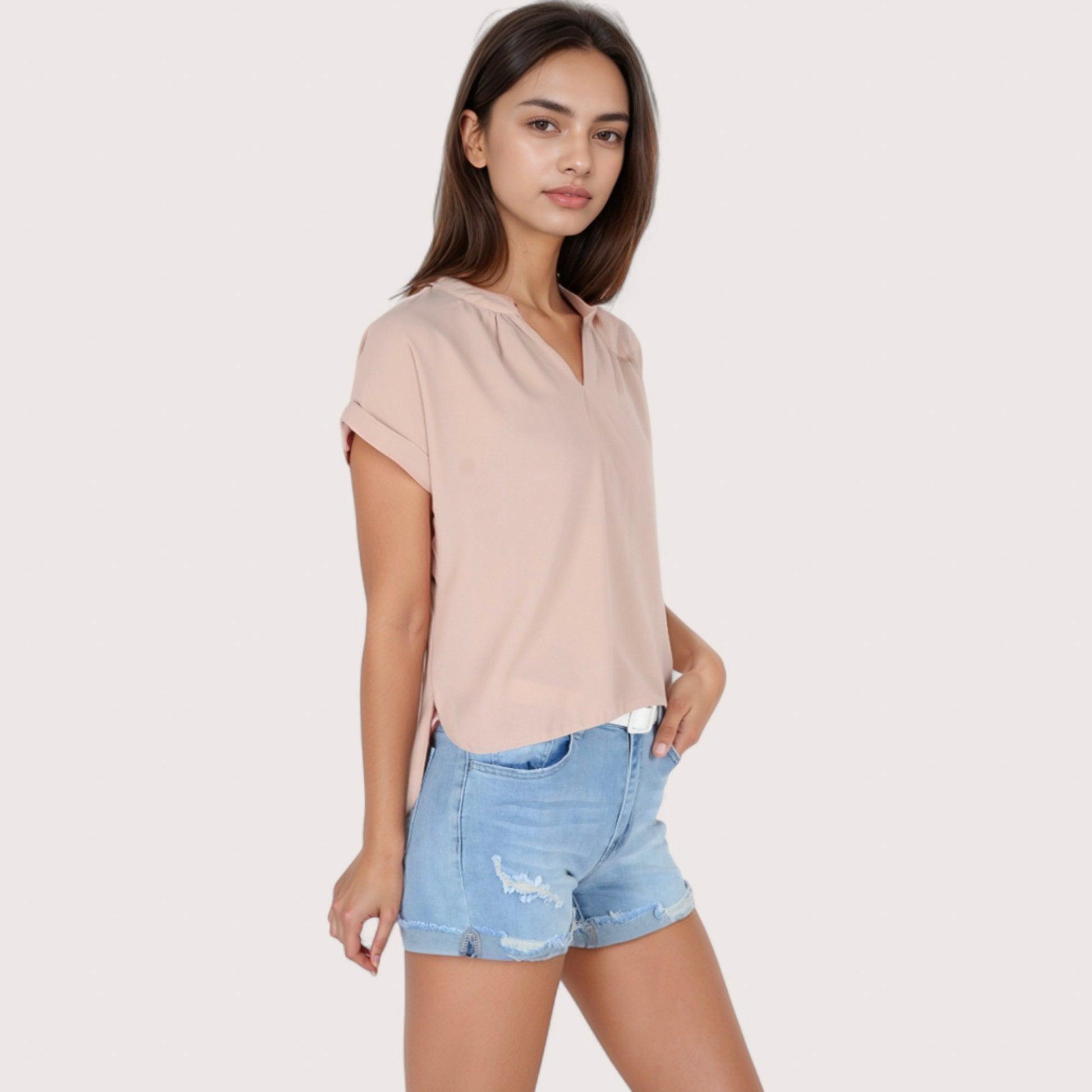 The Anna-Kaci Women's V-Neck Short Sleeve Blouse is a soft and feminine staple designed for easy pairing and everyday style. Featuring subtle pleats at the collar and rolled sleeves, this top delivers a polished look with effortless charm. The lightweight woven fabric drapes beautifully, offering comfort and breathability throughout the day. Tuck it into jeans or pair with trousers for a versatile and elevated outfit.